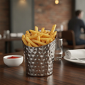 This 9cm hammered conical chip cup combines durability with refined design, ideal for professional kitchen and catering use. Its hammered texture enhances grip and adds a sophisticated touch, while the conical shape ensures easy serving and portion control. Crafted to withstand frequent use, it is a practical choice for presenting chips or snacks with style and efficiency.