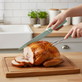 The Carving/Slicing Knife is crafted with a high-quality stainless steel blade, delivering precise, clean cuts for slicing and carving tasks. Its ergonomic handle provides comfort and control, reducing fatigue during use. Best paired with wooden or plastic cutting boards to preserve blade sharpness. For longevity, hand wash and dry immediately after use. This knife combines durability and efficiency for professional results.