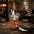 Elevate your table service with this 9cm copper hammered conical chip cup, a sophisticated addition to any catering setup. Handcrafted with traditional hammering techniques, the distinctive textured finish catches light beautifully while the conical design provides optimal chip presentation. The durable copper construction ensures longevity through repeated use, making it an investment-worthy piece for professional establishments. Perfect for upscale dining experiences where presentation matters as much as the meal itself.