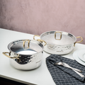 The 8 Piece Erna Cookware Pot Set with gold handles, designed by Korkmaz, is an essential addition to any kitchen. Crafted from strong 18/10 stainless steel, it boasts an induction base and triplex heavy bounded capsule bottom for precise heat distribution. The sleek exterior surfaces and unique matte finished lines provide a sophisticated touch, and for added convenience, it is dishwasher safe for effortless cleaning. Elevate your cooking skills with this top-quality set.
