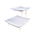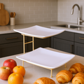 This 2-tier platter set with gold stand is easy to assemble and store, making it ideal for gatherings. Its attractive and functional design enhances the dining experience. Note: Not suitable for dishwasher, microwave, or oven use.