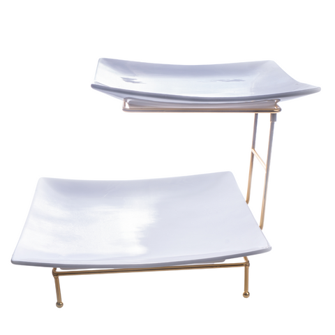 This 2-tier platter set with gold stand is easy to assemble and store, making it ideal for gatherings. Its attractive and functional design enhances the dining experience. Note: Not suitable for dishwasher, microwave, or oven use.
