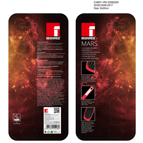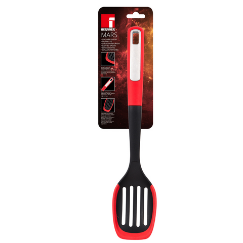 Expertly crafted for your cooking needs, the Mars Slotted Spoon features a heat-resistant silicone edge for safe and efficient stirring. The ergonomic design provides comfortable handling while the premium quality silicone and polymer materials ensure durability and longevity. Not dishwasher safe.